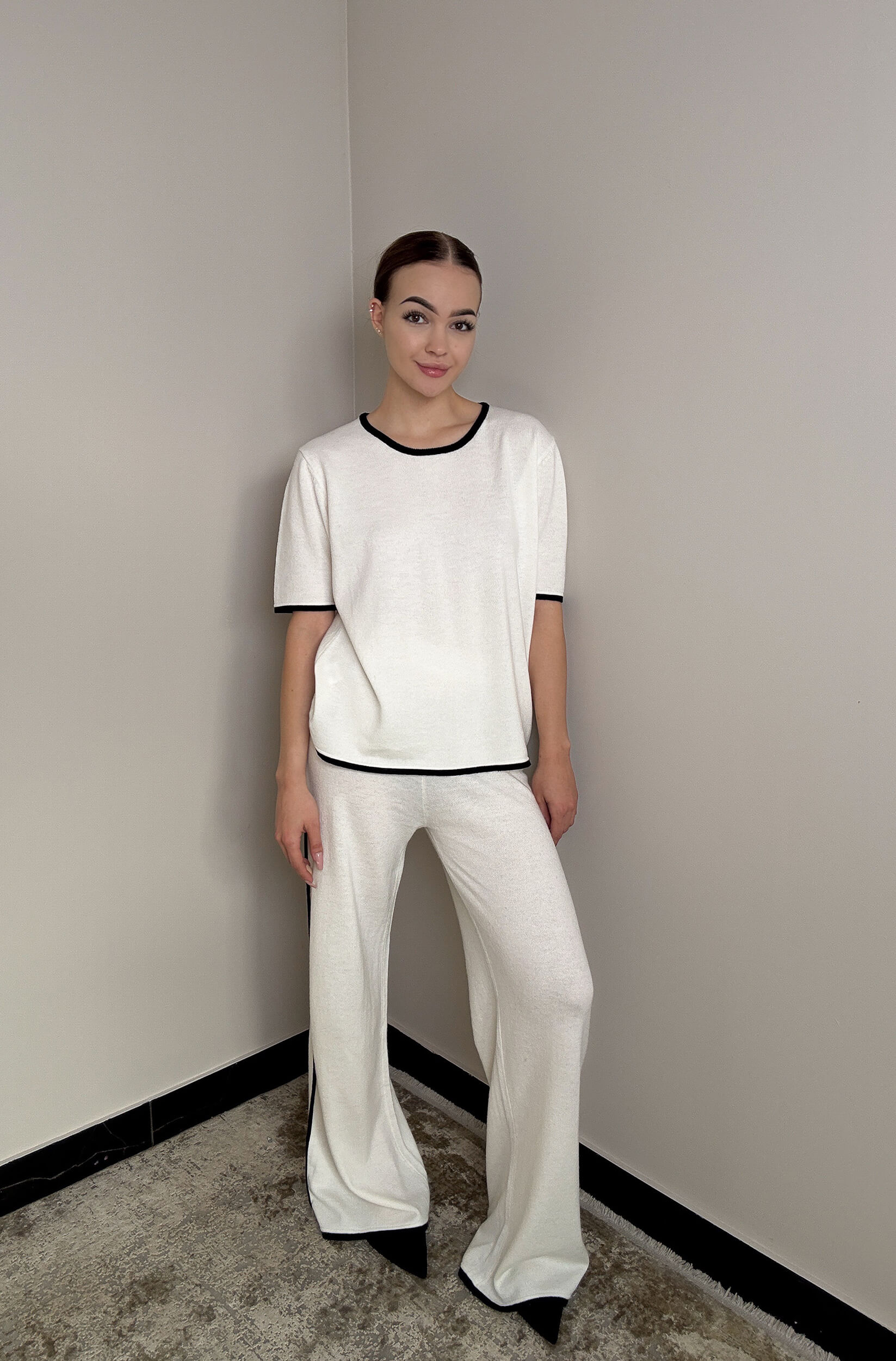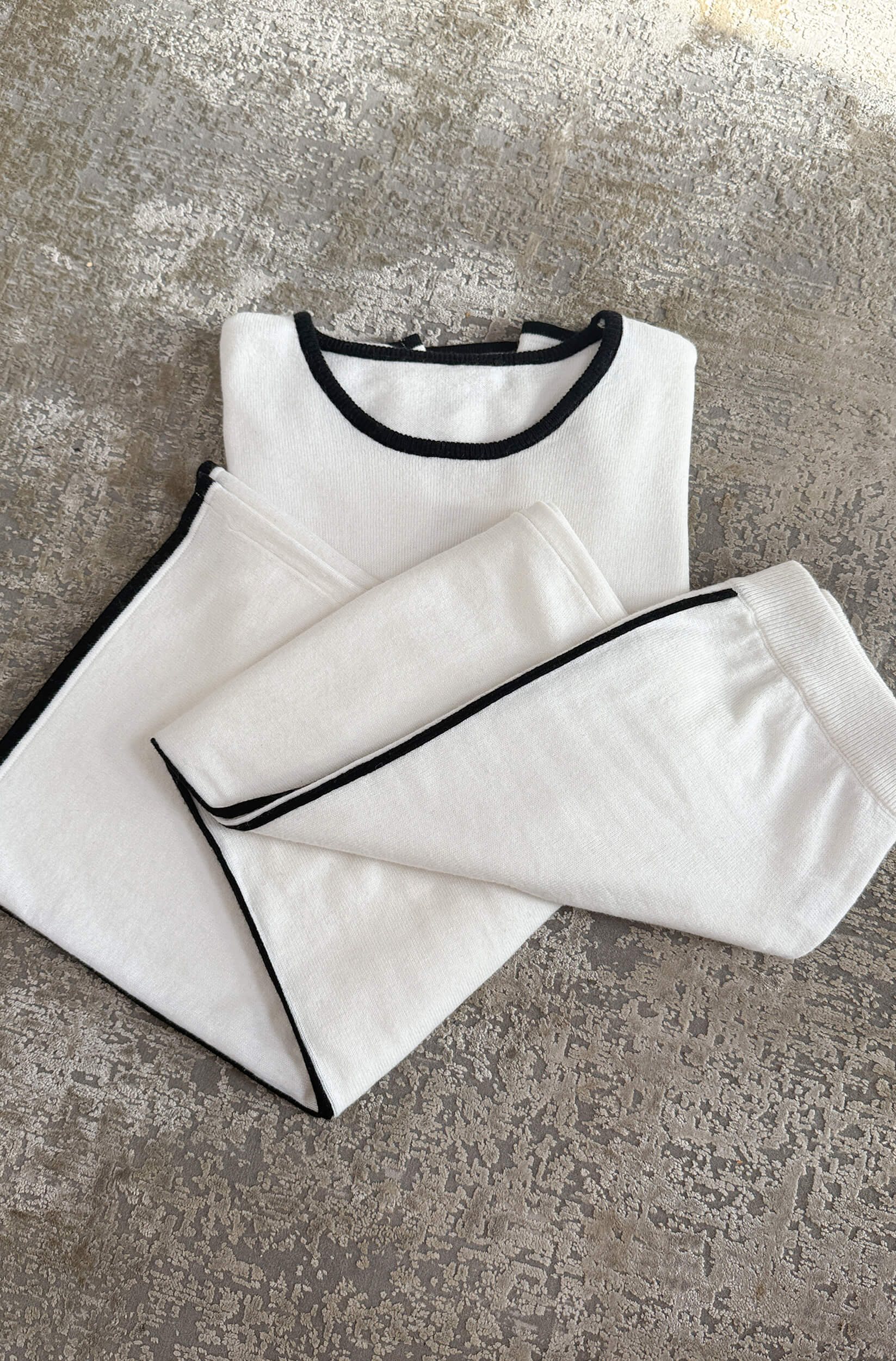 A stylish and comfortable set in soft knitwear with an elegant finish. The loose fit ensures a comfortable fit, while the black piping adds a subtle touch of elegance. Ideal for both everyday relaxed and casual styling.