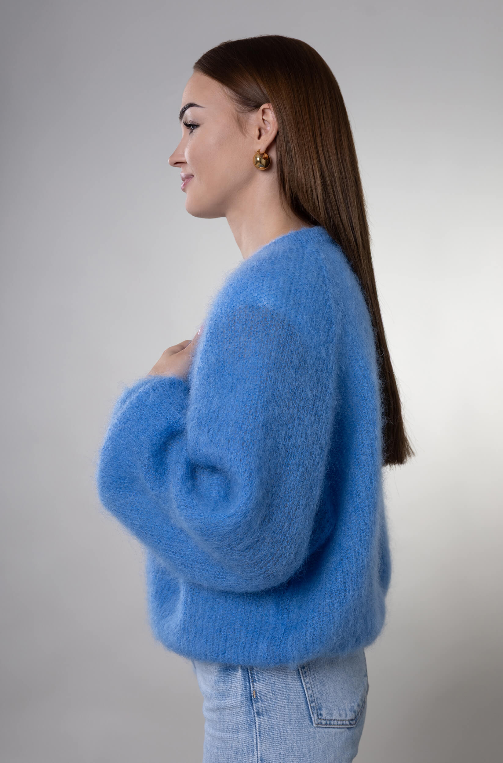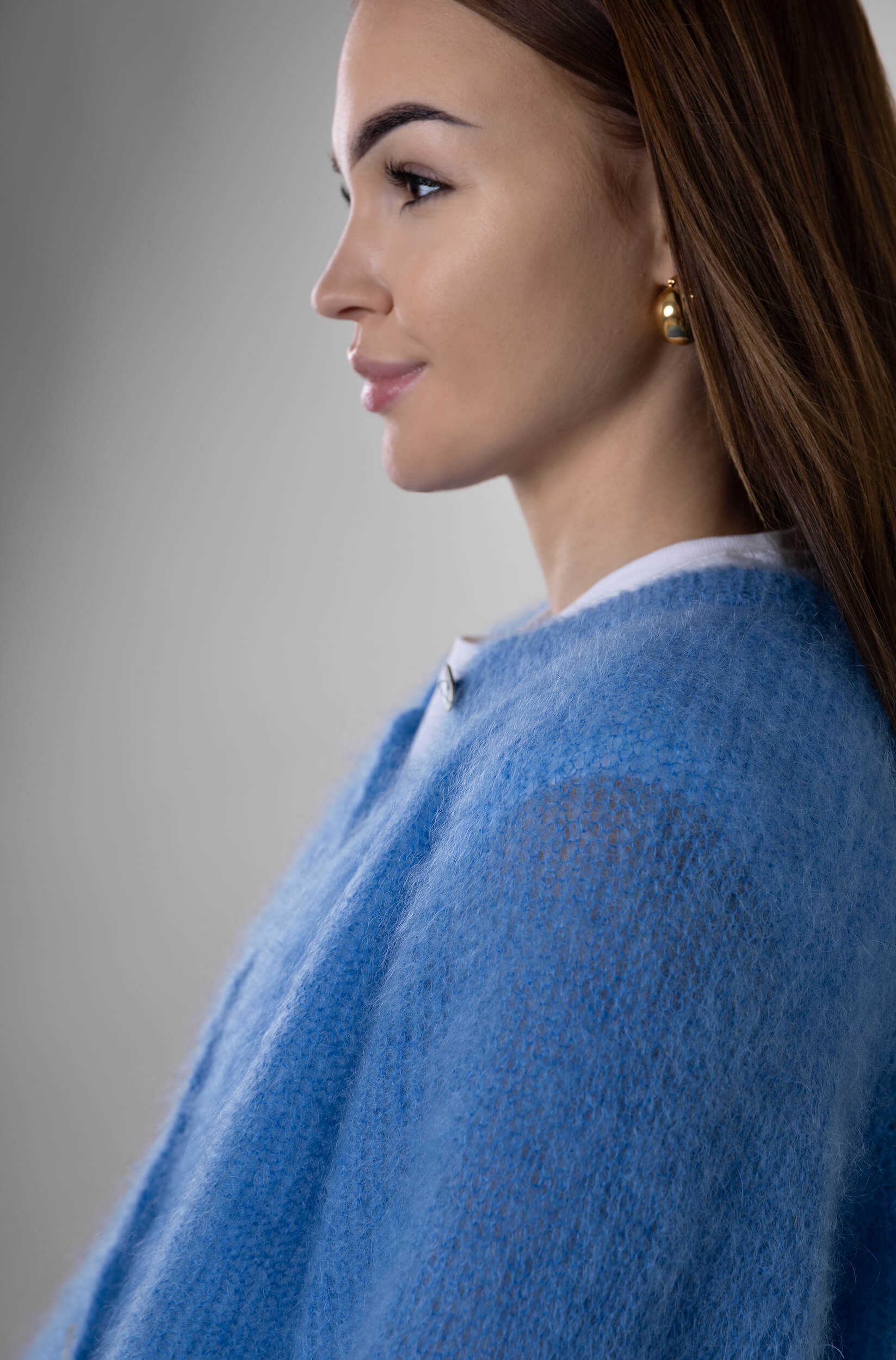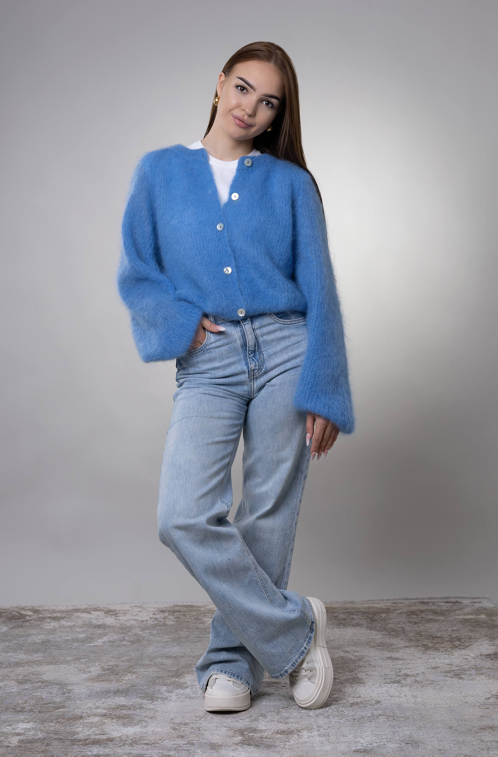 Kardigan z wysokogatunkowego moheru o miękkiej, puszystej fakturze. Luźny krój z obniżoną linią ramion i eleganckim zapięciem na guziki. Idealny na chłodniejsze dni, dodaje stylu każdej stylizacji.