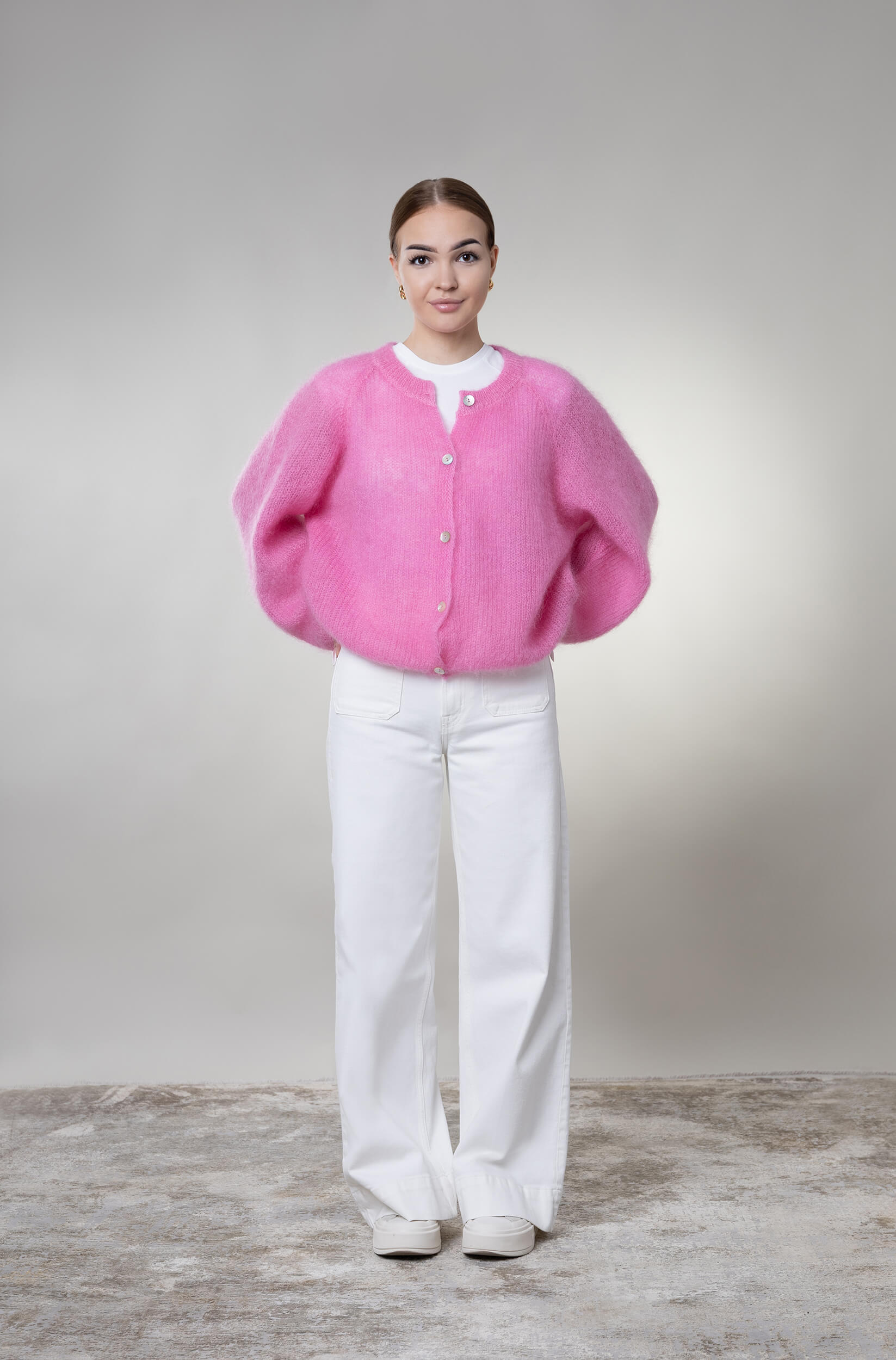 Kardigan z wysokogatunkowego moheru o miękkiej, puszystej fakturze. Luźny krój z obniżoną linią ramion i eleganckim zapięciem na guziki. Idealny na chłodniejsze dni, dodaje stylu każdej stylizacji.