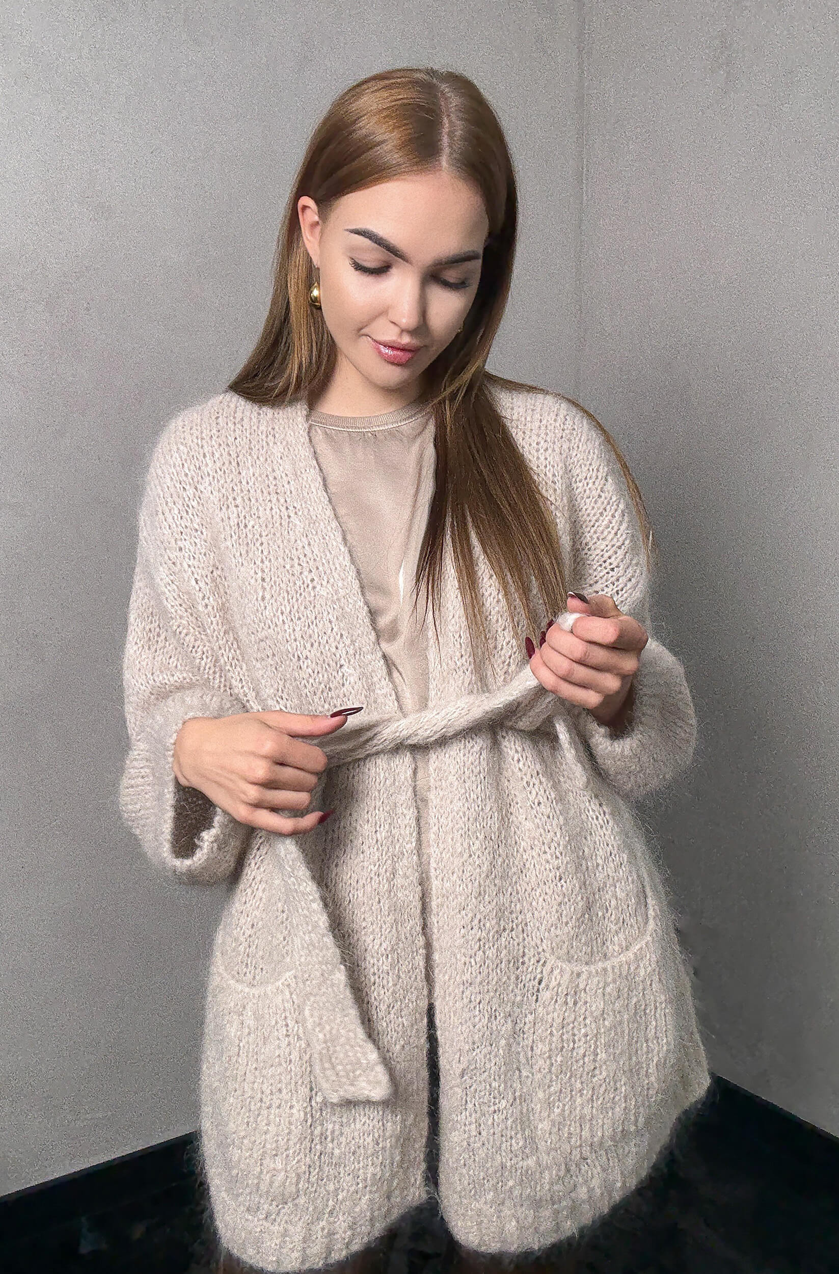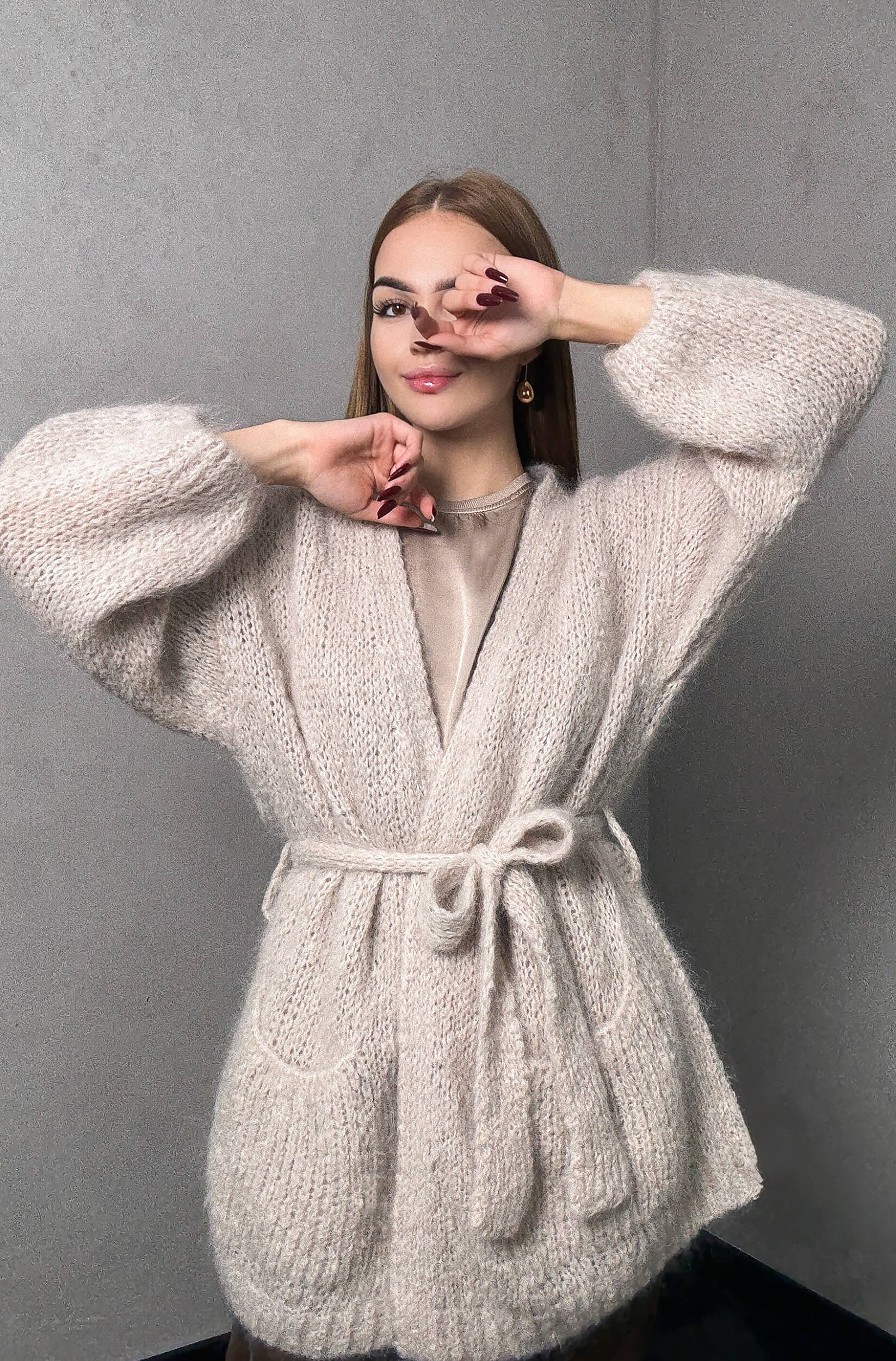 Stylowy kardigan wykonany z miękkiej przędzy moherowej, charakteryzujący się lekkością i puszystą fakturą. Model z paskiem, który podkreśla talię i pozwala na regulację fasonu. Uniwersalny krój sprawia, że doskonale sprawdza się zarówno w eleganckich, jak i codziennych stylizacjach, zapewniając komfort i ponadczasową elegancję.
