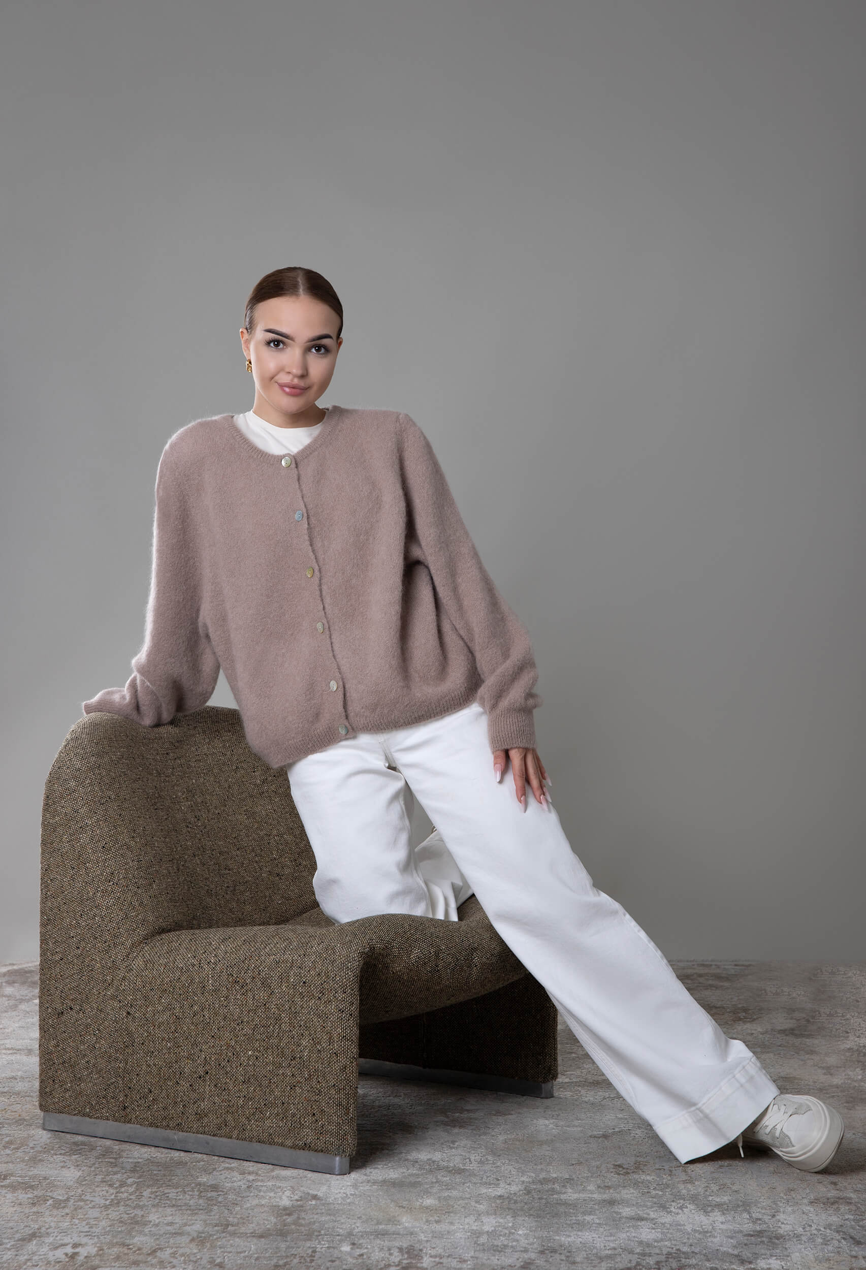Kardigan z przędzy alpaki, charakteryzujący się wyjątkową miękkością i szlachetnym wykończeniem. Minimalistyczny, lekko oversize’owy krój z eleganckim zapięciem na guziki łączy komfort noszenia z wyrafinowanym stylem.