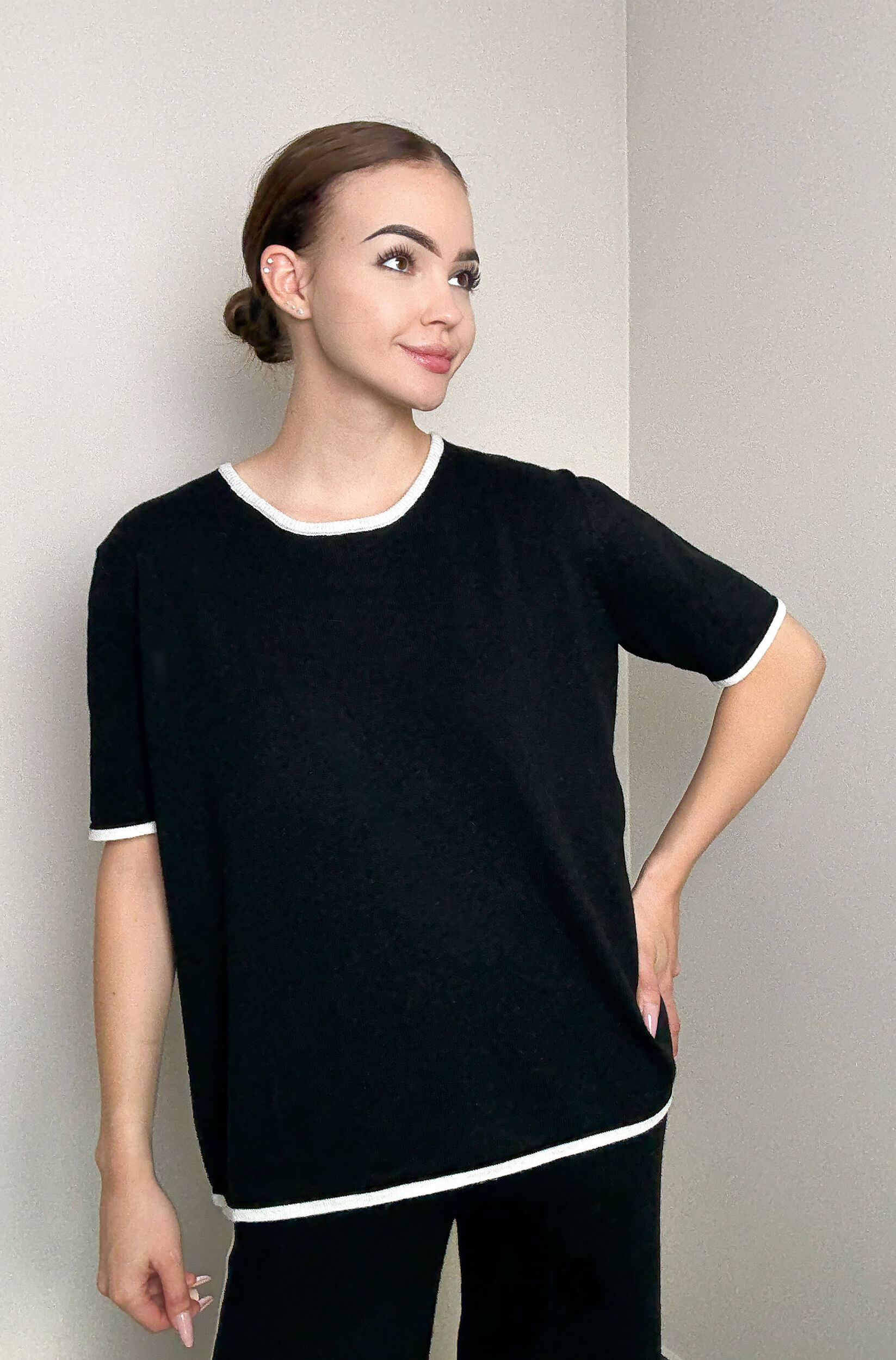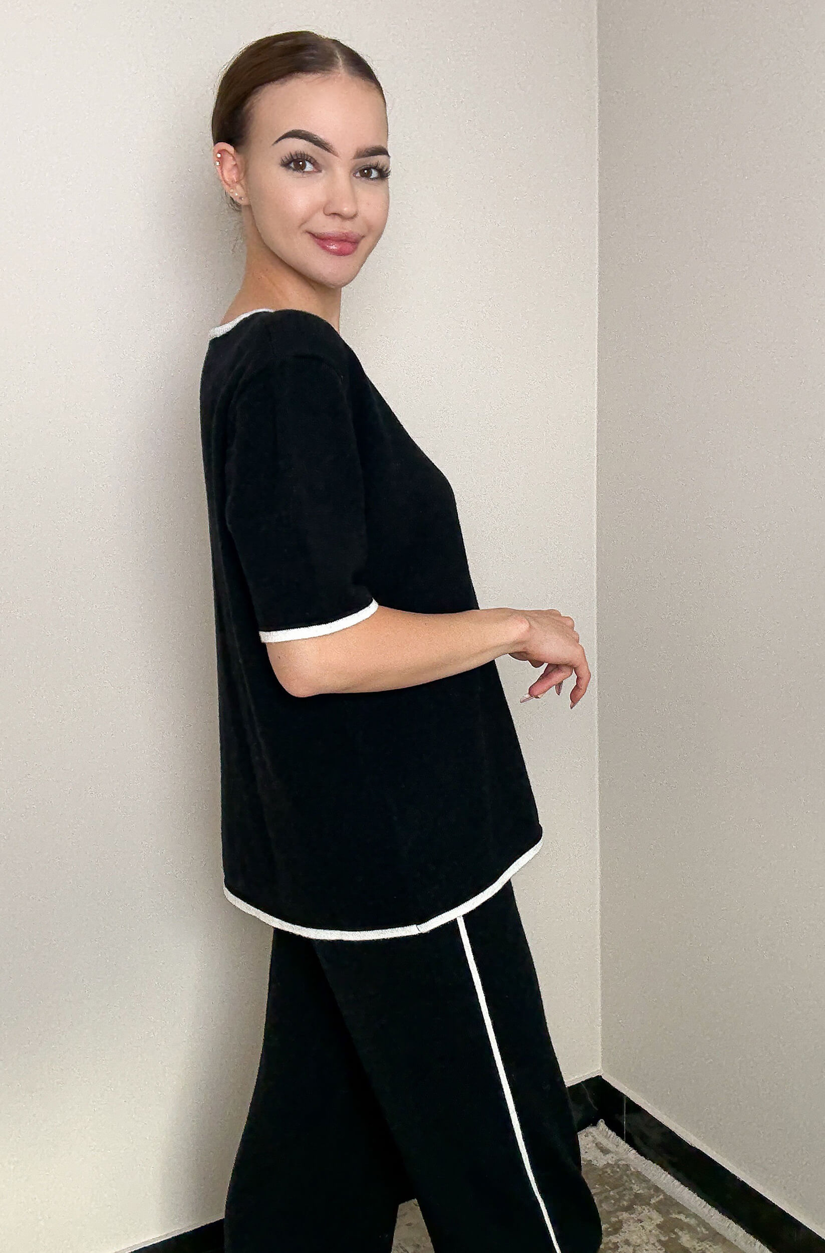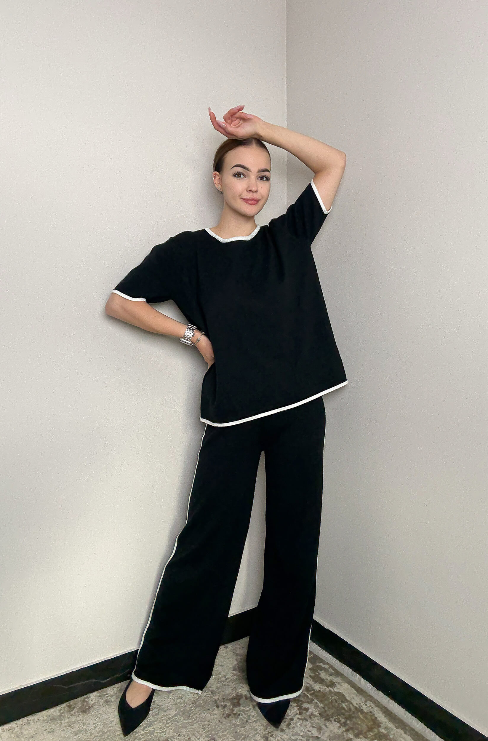 Stylowy i wygodny komplet z miękkiej dzianiny o eleganckim wykończeniu. Luźny krój zapewnia komfort noszenia, a czarna lamówka dodaje całości subtelnej elegancji. Idealny zarówno do codziennego relaksu, jak i casualowych stylizacji.