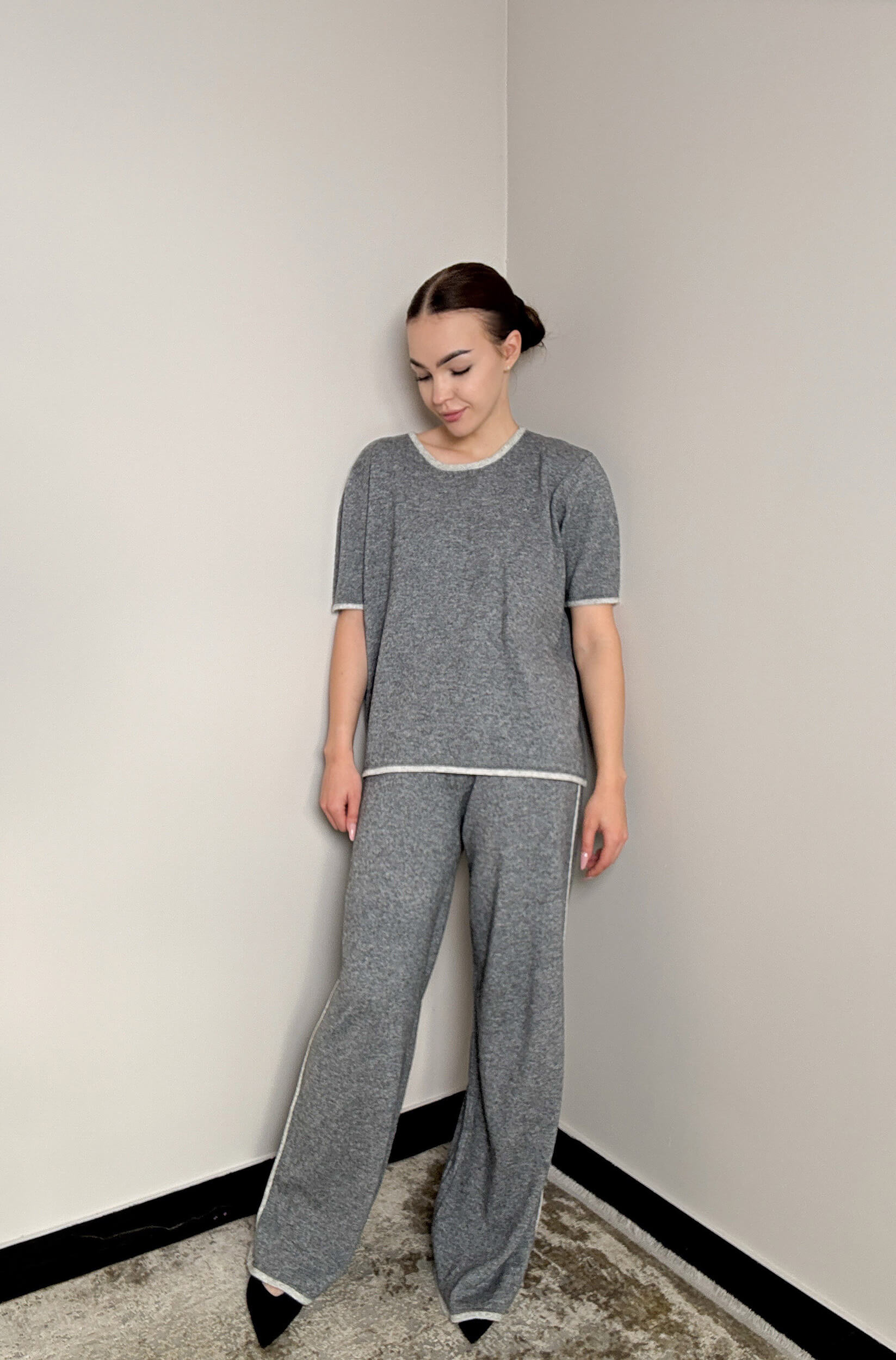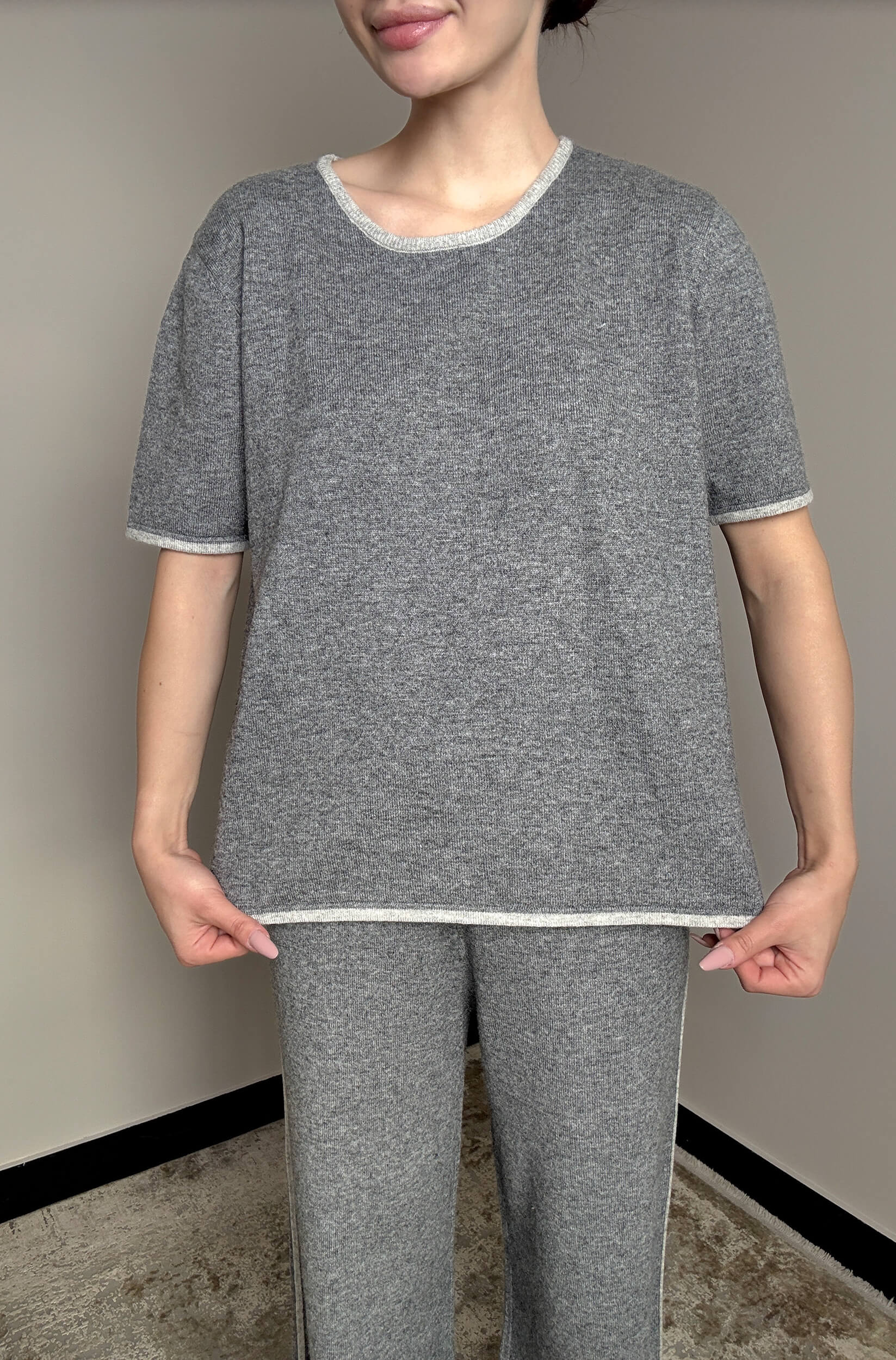 Stylowy i wygodny komplet z miękkiej dzianiny o eleganckim wykończeniu. Luźny krój zapewnia komfort noszenia, a czarna lamówka dodaje całości subtelnej elegancji. Idealny zarówno do codziennego relaksu, jak i casualowych stylizacji.