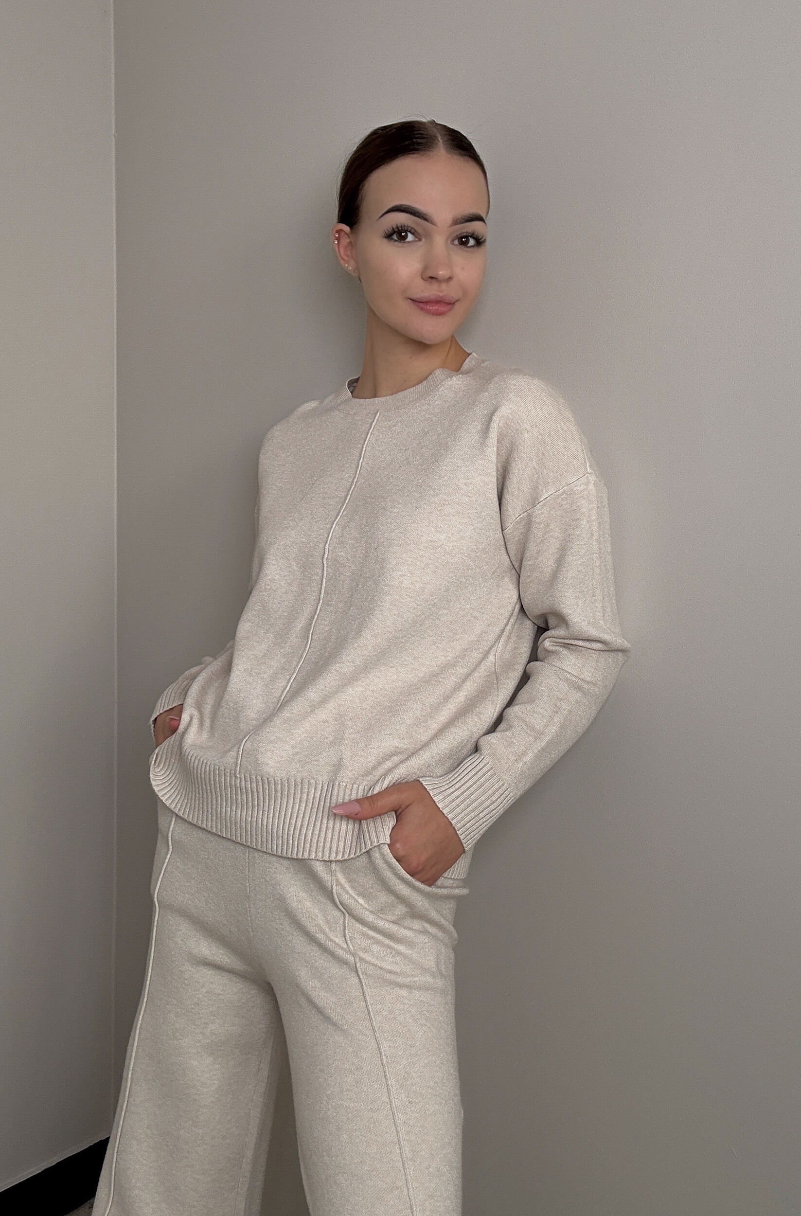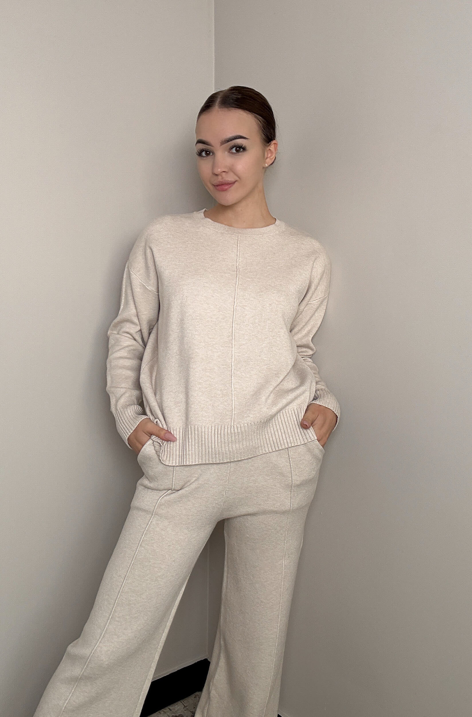 Stylowy i wygodny komplet z miękkiej dzianiny o eleganckim wykończeniu. Luźny krój zapewnia komfort noszenia, a czarna lamówka dodaje całości subtelnej elegancji. Idealny zarówno do codziennego relaksu, jak i casualowych stylizacji.