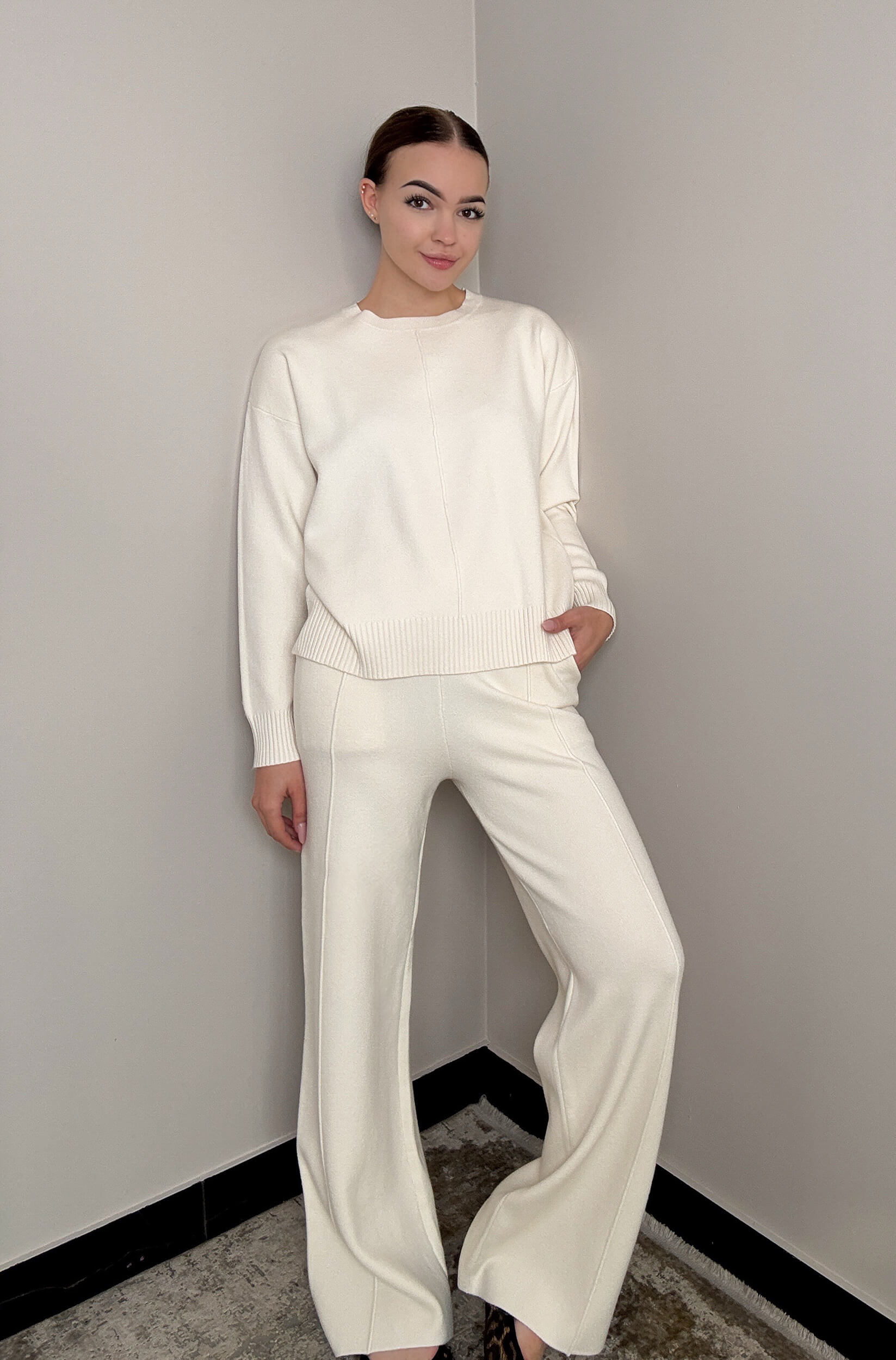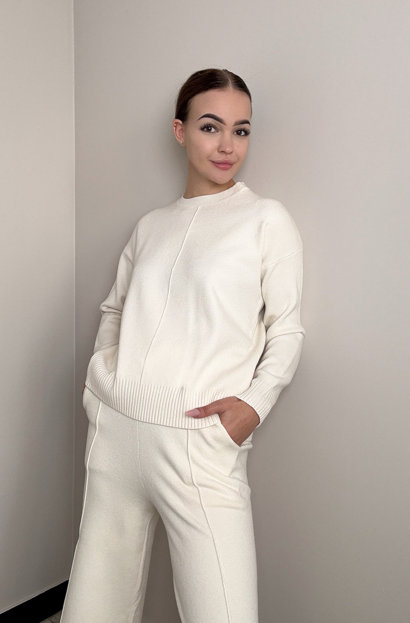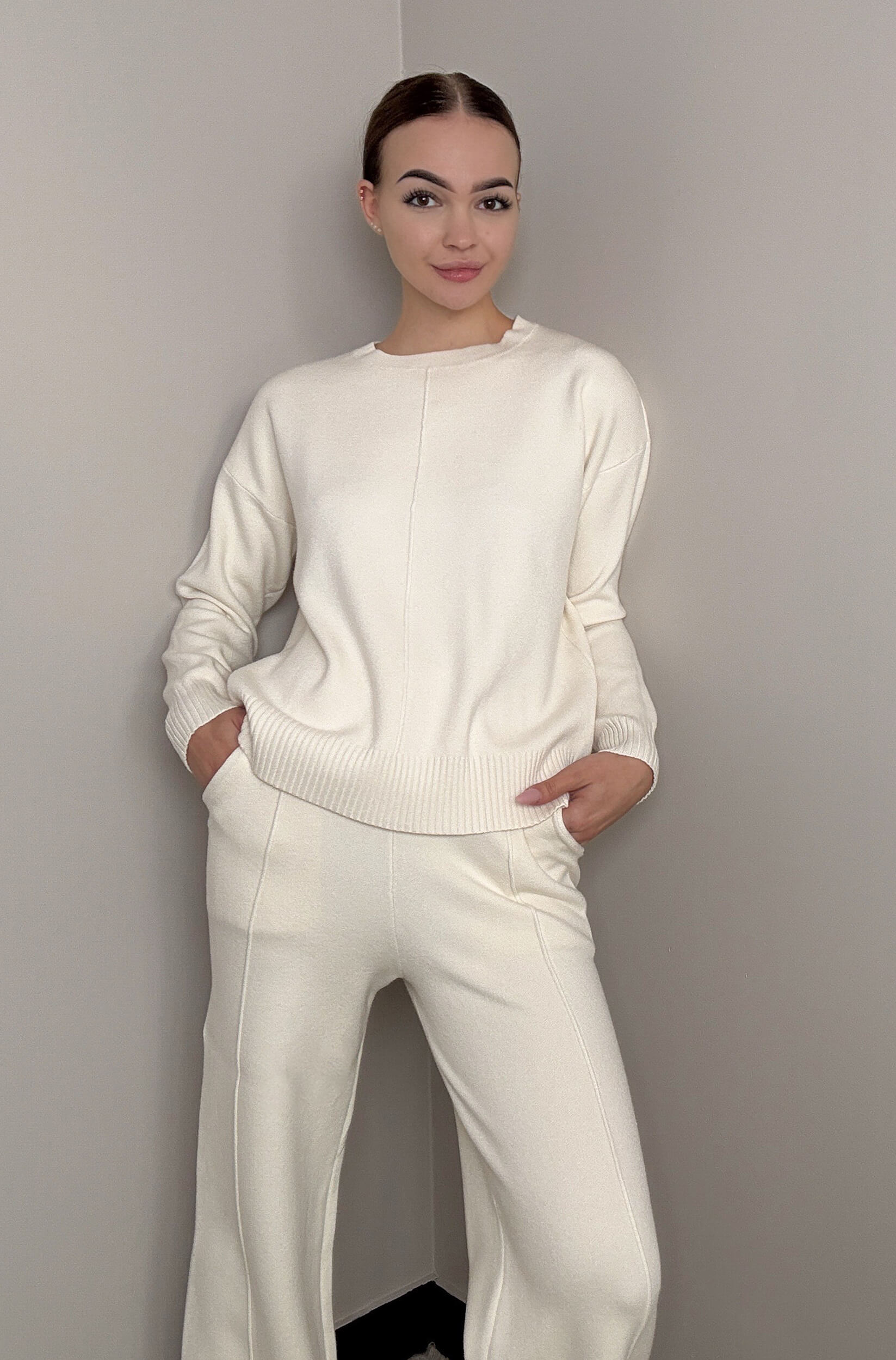 Stylowy i wygodny komplet z miękkiej dzianiny o eleganckim wykończeniu. Luźny krój zapewnia komfort noszenia, a czarna lamówka dodaje całości subtelnej elegancji. Idealny zarówno do codziennego relaksu, jak i casualowych stylizacji.