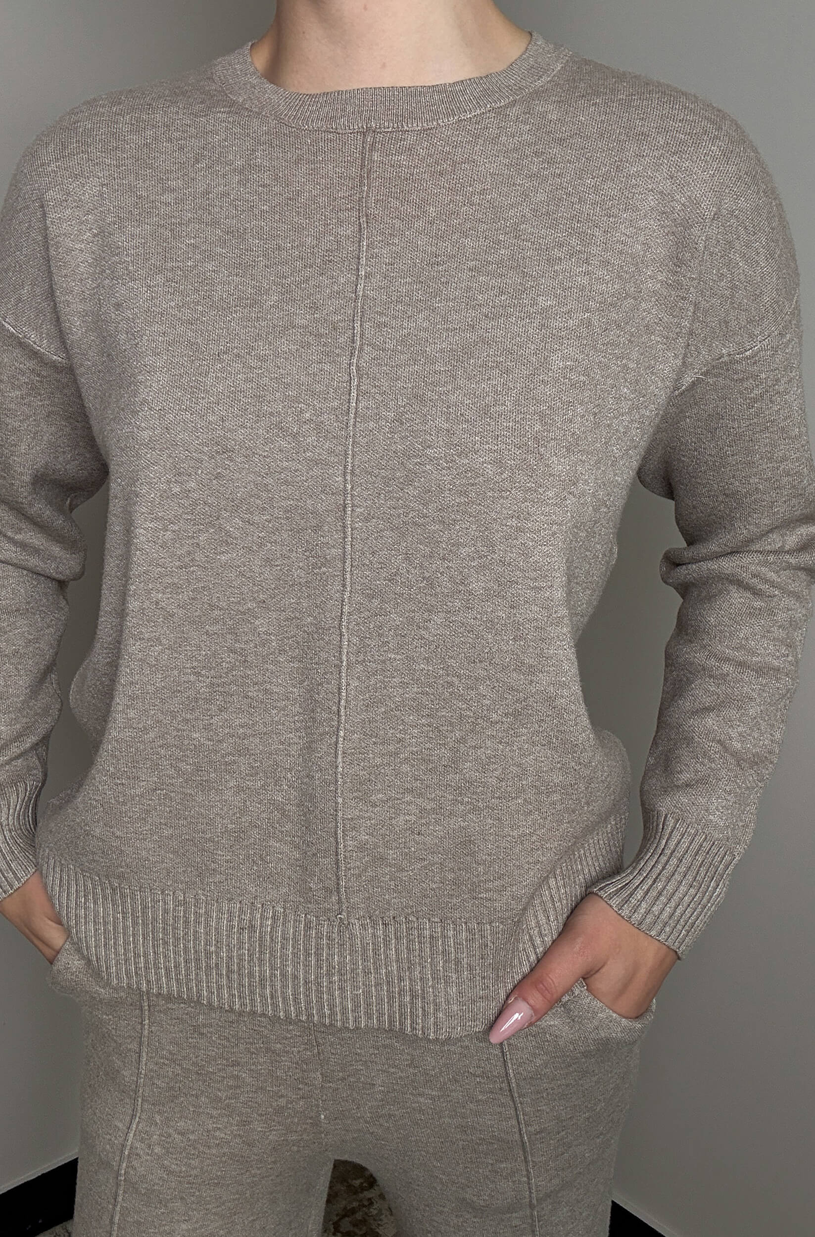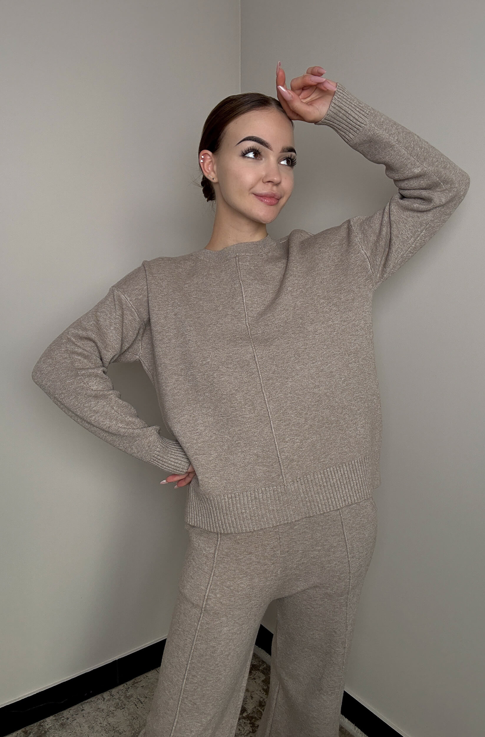 Stylowy i wygodny komplet z miękkiej dzianiny o eleganckim wykończeniu. Luźny krój zapewnia komfort noszenia, a czarna lamówka dodaje całości subtelnej elegancji. Idealny zarówno do codziennego relaksu, jak i casualowych stylizacji.