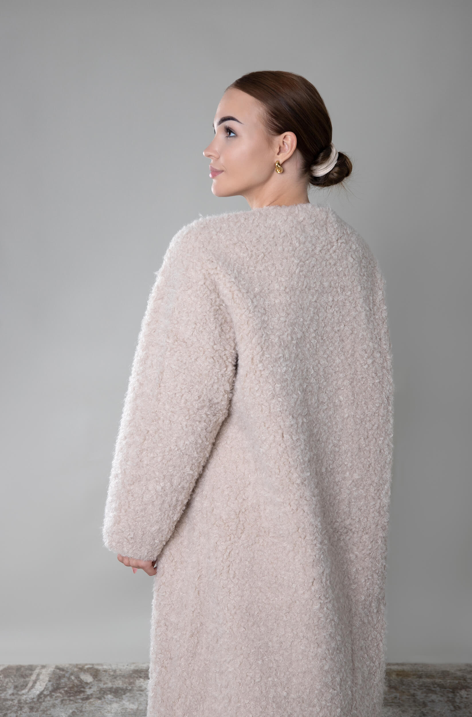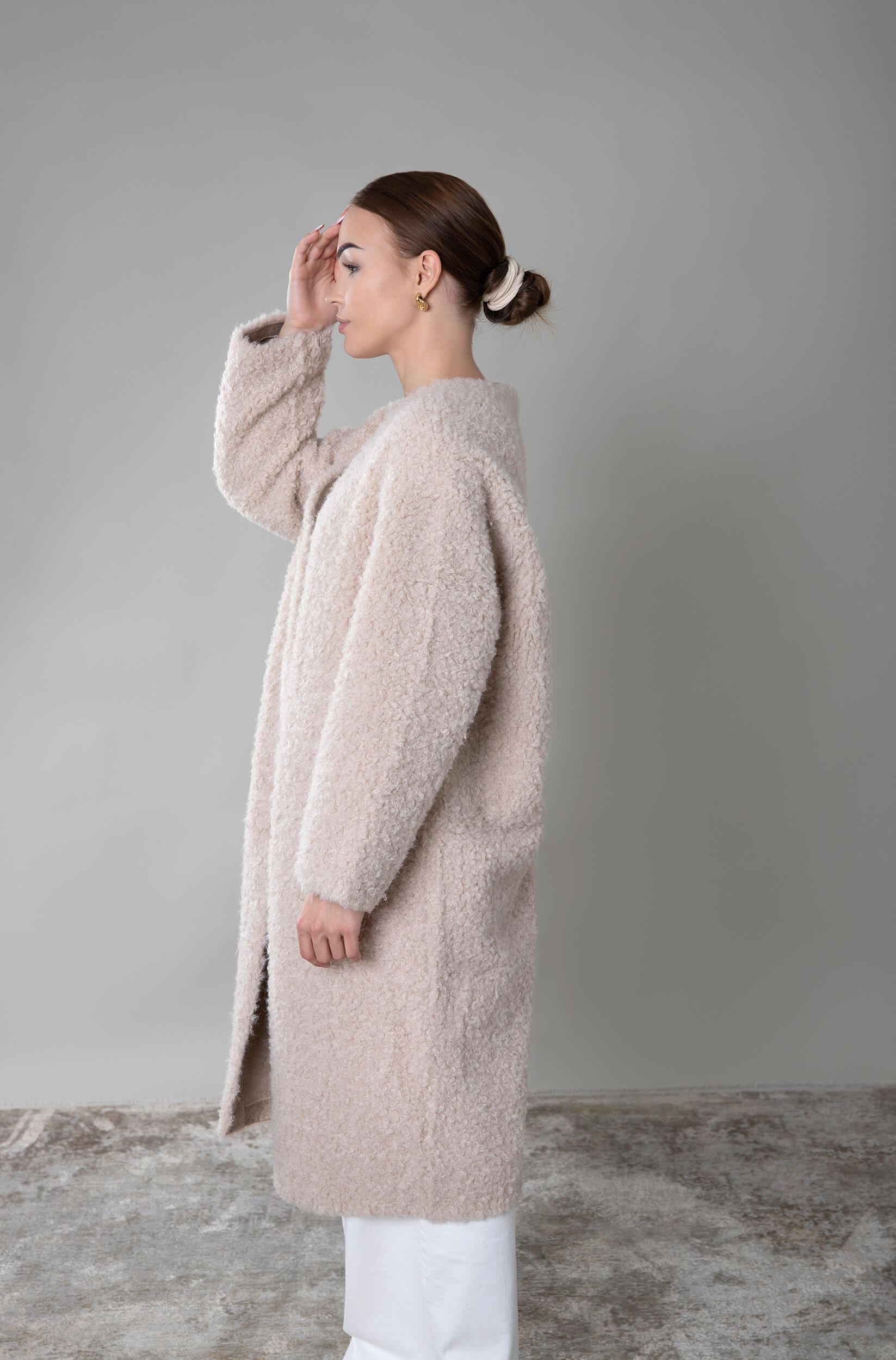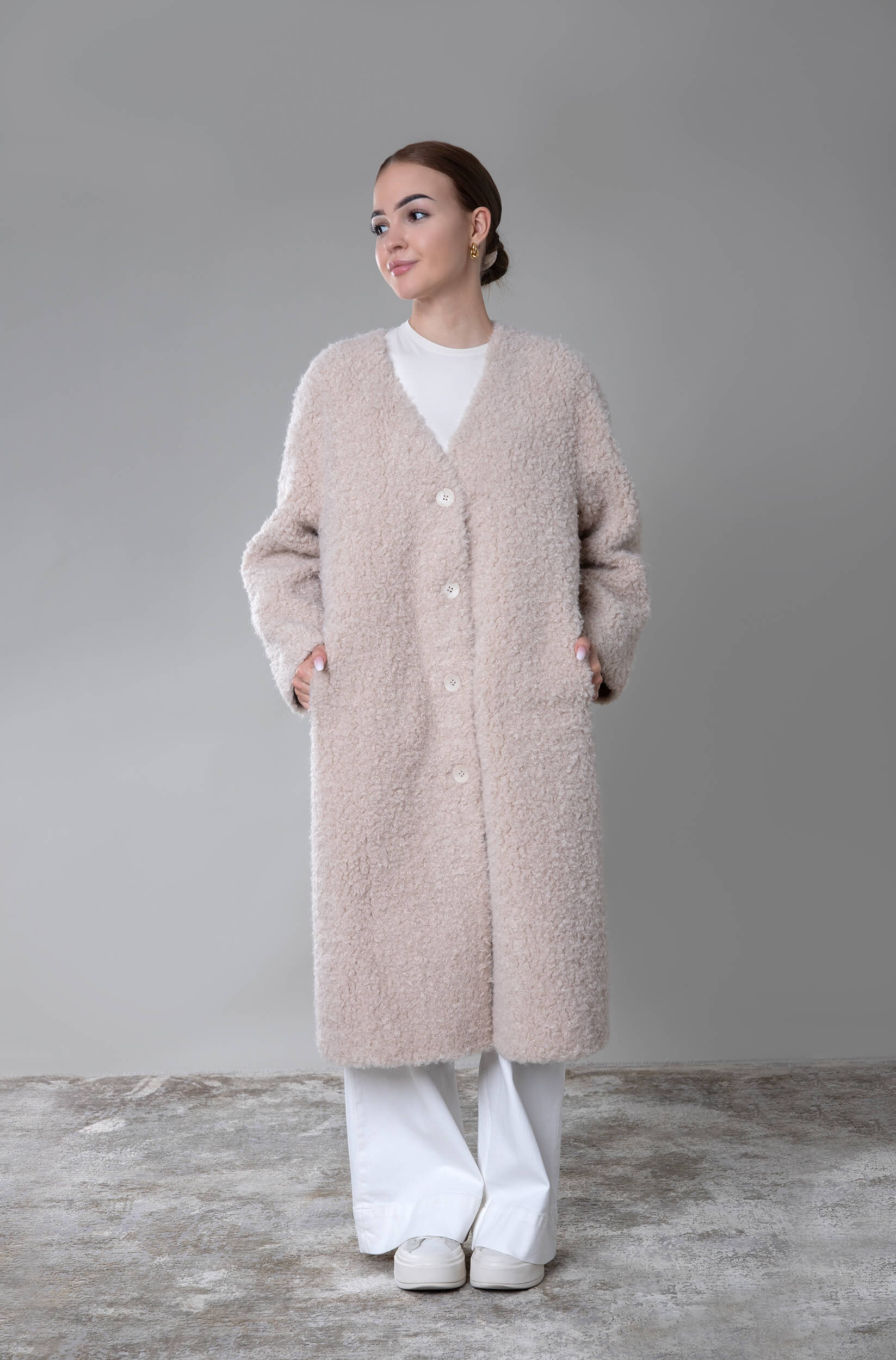 Płaszcz „Rosa” to stylowa i ciepła propozycja na chłodniejsze dni. Wykonany z miękkiego materiału typu „teddy”, otula sylwetkę i zapewnia komfort noszenia. Klasyczny krój z guzikami i kieszeniami sprawdzi się zarówno na co dzień, jak i do eleganckich stylizacji.