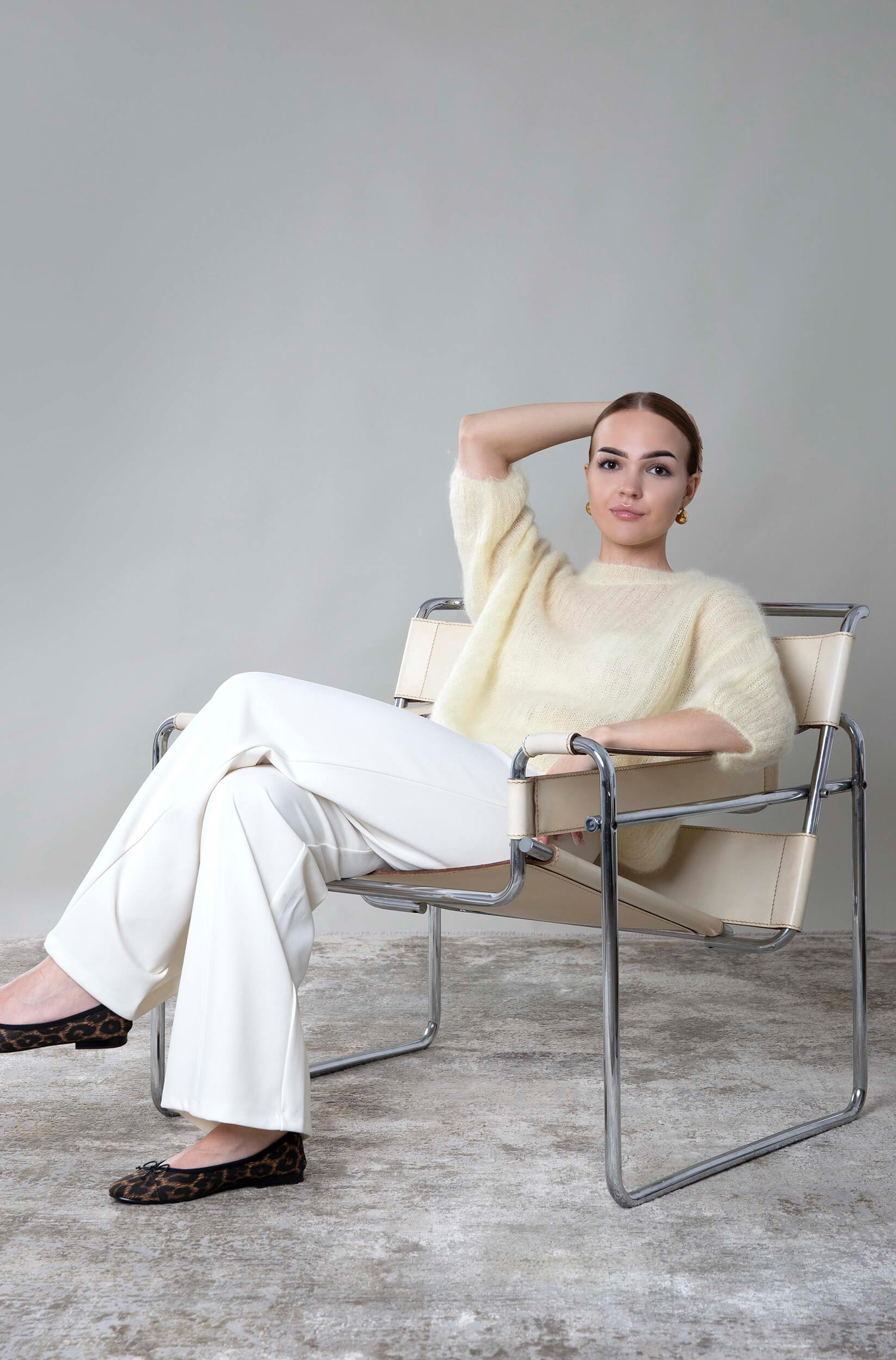 Sweter z wysokogatunkowego moheru o lekkiej, puszystej fakturze. Luźny krój z rękawem 3/4 zapewnia swobodę ruchów, a delikatny połysk włókien dodaje elegancji i kobiecego charakteru każdej stylizacji.