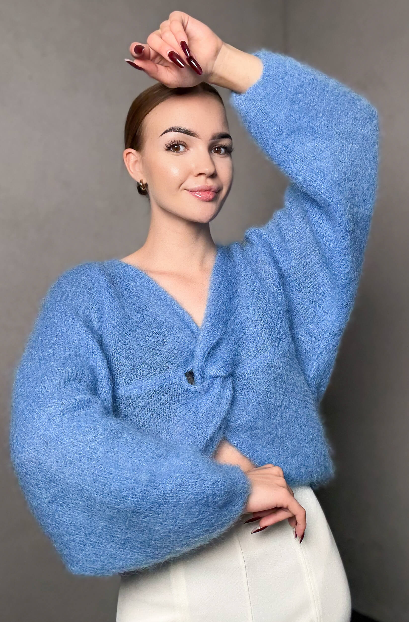Sweter wykonany z miękkiej, puszystej przędzy moherowej wyróżnia się efektownym węzłem, który może być noszony zarówno z przodu, jak i z tyłu. Model ten oferuje dwie odsłony: zmysłowy dekolt lub elegancki detal na plecach.