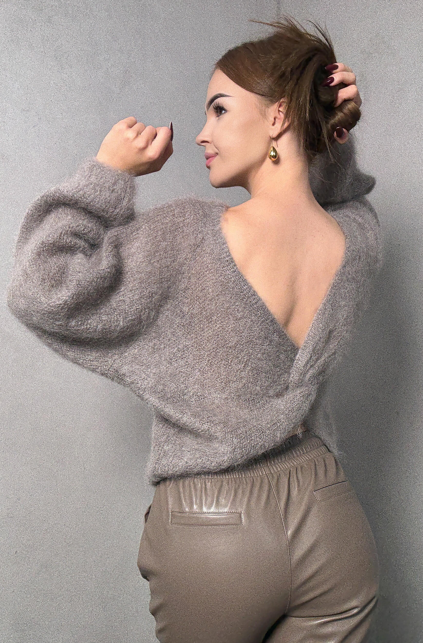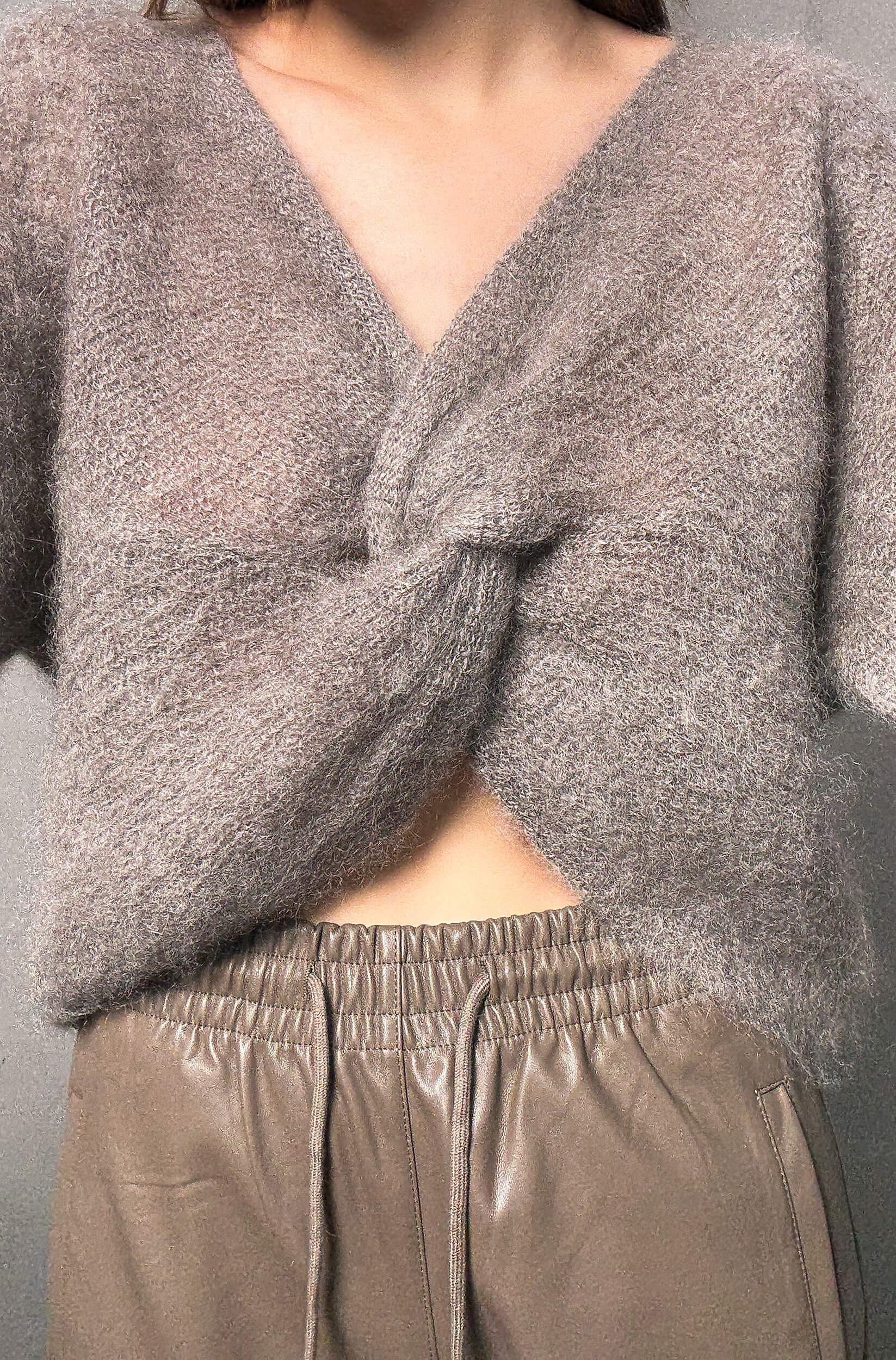 Sweter wykonany z miękkiej, puszystej przędzy moherowej wyróżnia się efektownym węzłem, który może być noszony zarówno z przodu, jak i z tyłu. Model ten oferuje dwie odsłony: zmysłowy dekolt lub elegancki detal na plecach.