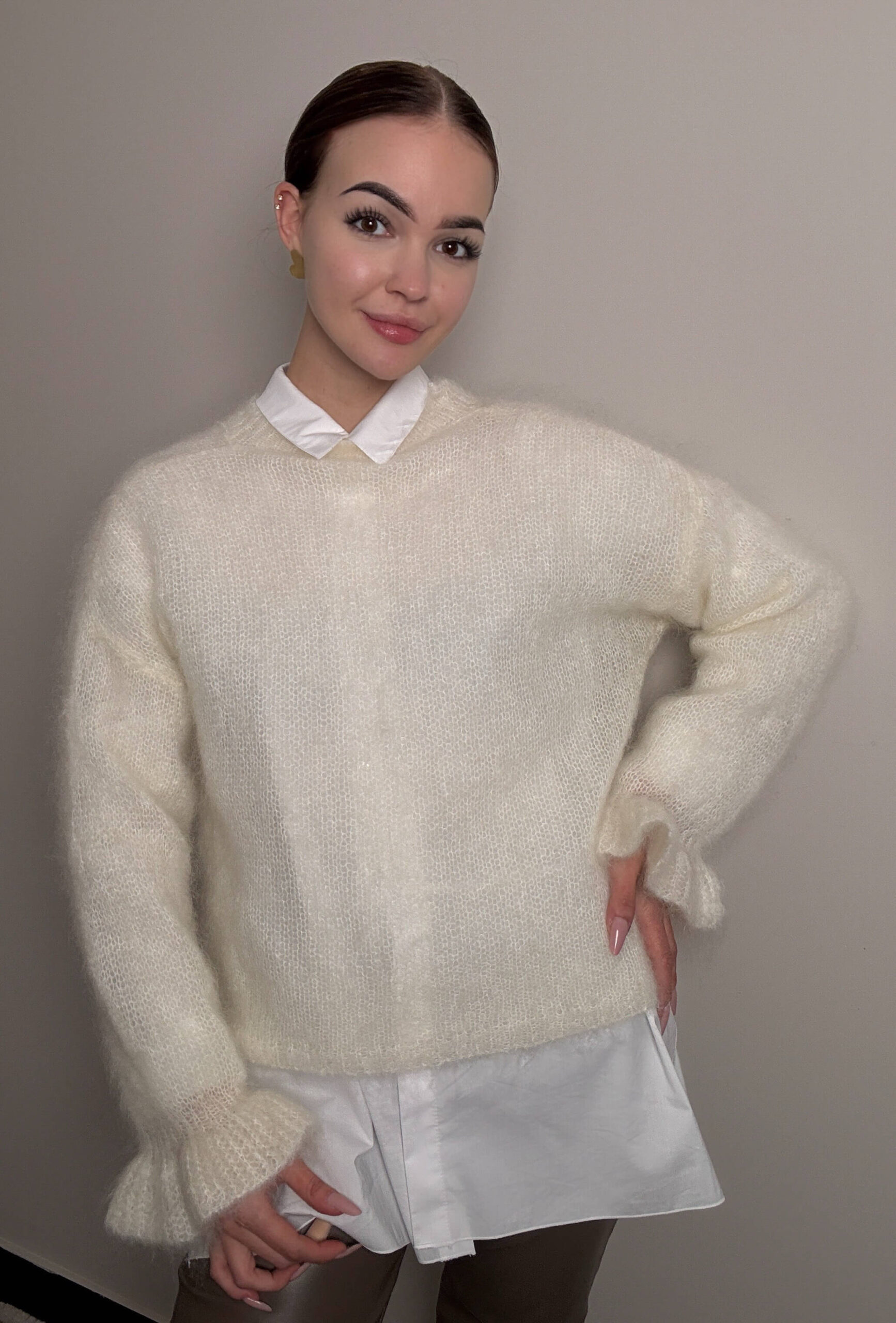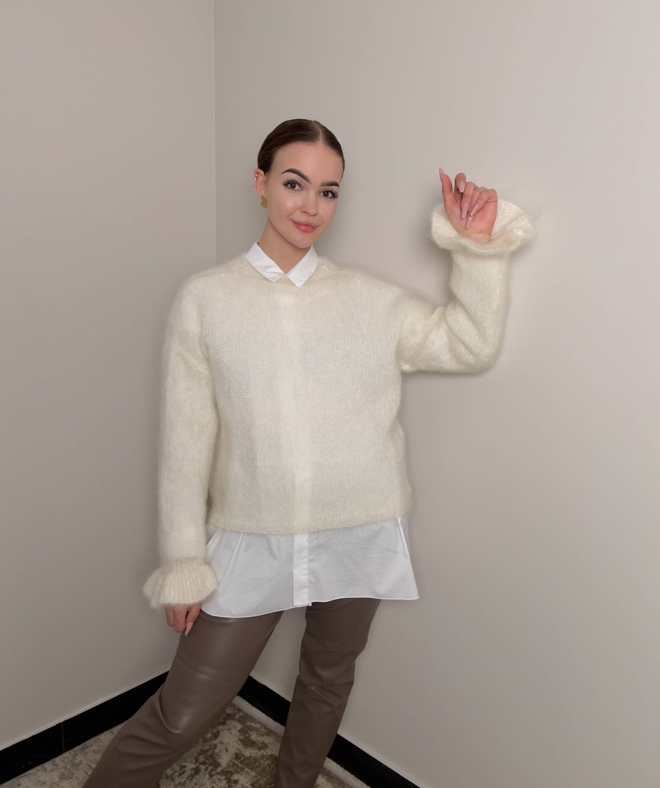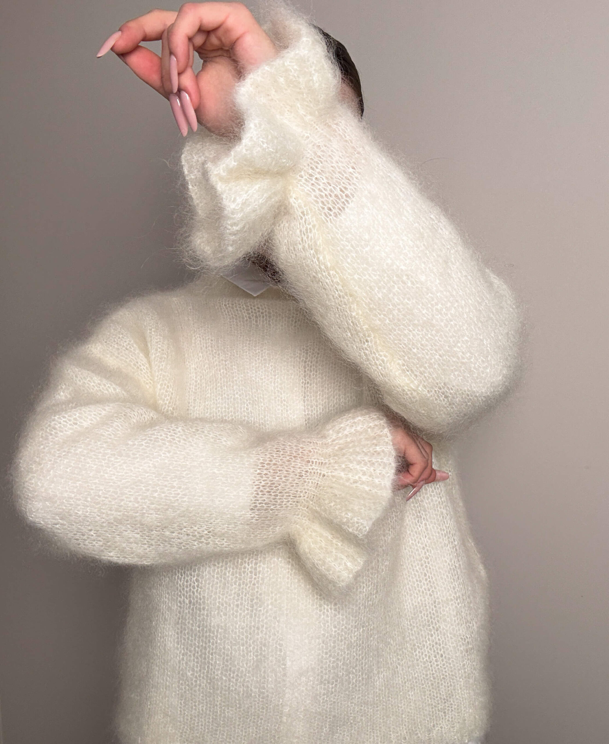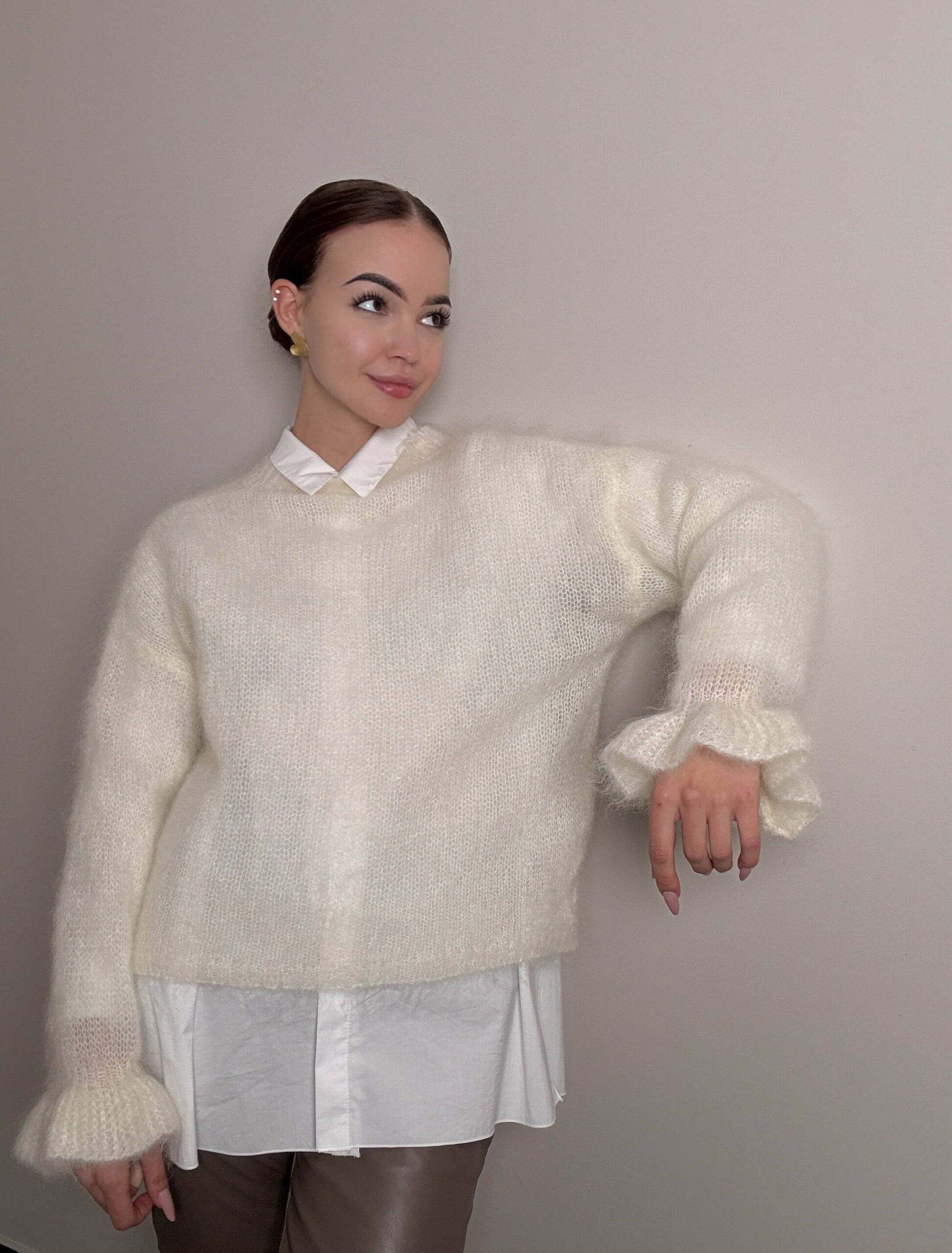 Sweter z wysokogatunkowego moheru z ozdobną falbanką na rękawach o puszystej fakturze. Klasyczny fason z długim rękawem, łączy elegancję z komfortem noszenia.